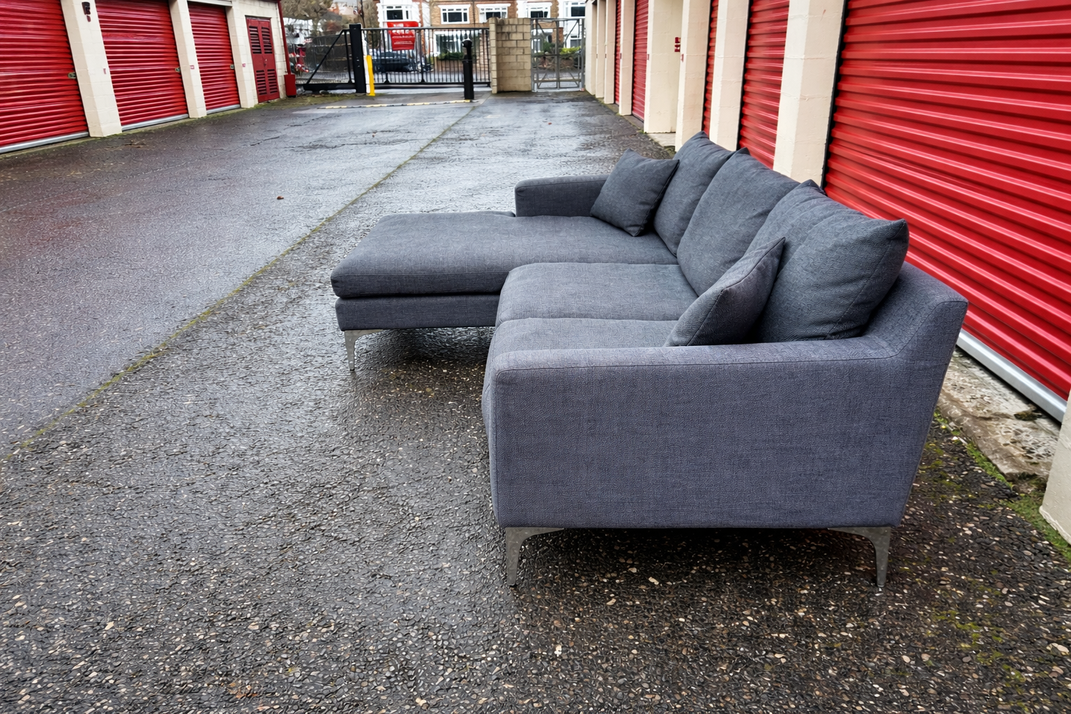 Modern L shape grey/blue sofa from Dwell in excellent condition.