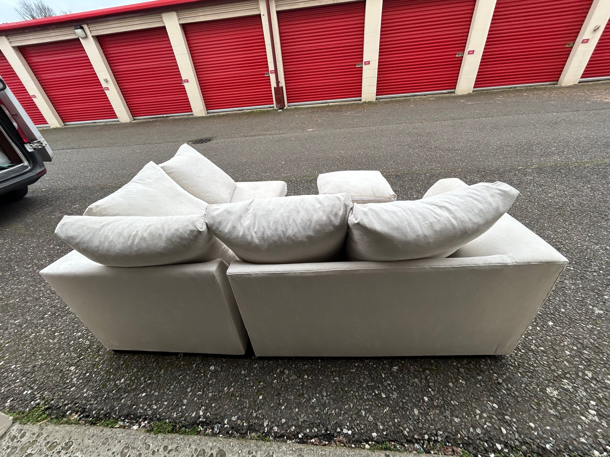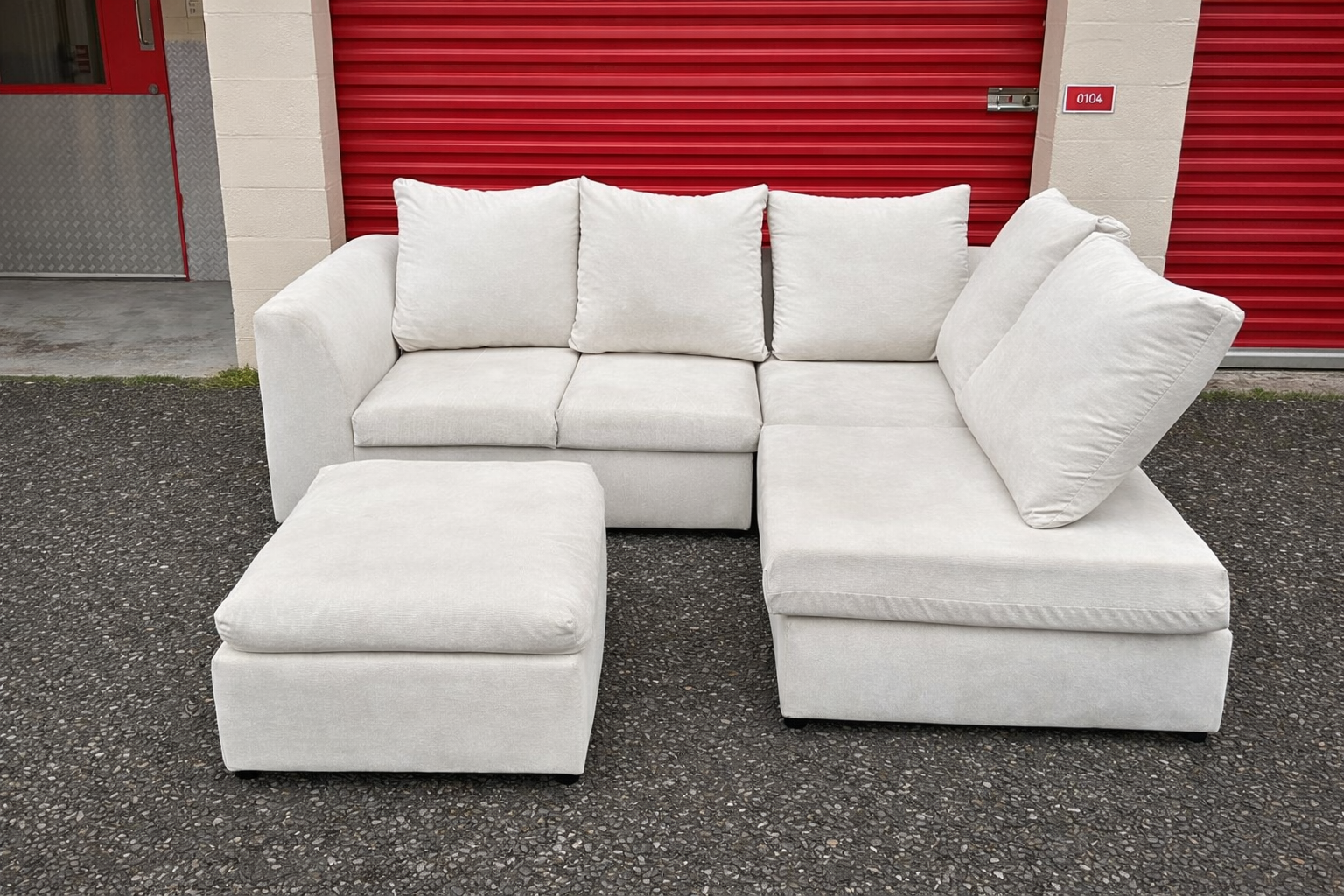Light beige/cream fabric corner sofa and footstool in excellent condition.